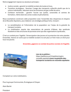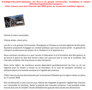 La Vienne Démocratique reproduit un communiqué du groupe PCF à la région et invite à signer la pétition demandant la gratuité du transport pour les lycéen-ne-s, étudiant-e-s et apprenti-e-s de Nouvelle-Aquitaine : https://petitions.pcf.fr/petition/org/cr-nouvelle-aquitaine/pour-la-gratuite-des-transports-scolaires-en-nouvelle-aquitaine