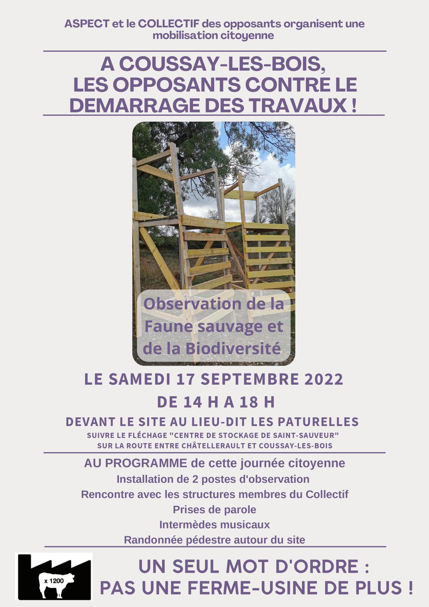 Le collectif d’opposants à la ferme-usine de Coussay-les-Bois annonce une mobilisation citoyenne contre le démarrage des travaux samedi 17 septembre à 14h :